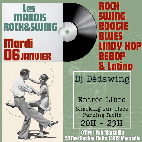Date : Mardi 06/01/2026 Horaires : 20h-23h Tarifs : Entrée libre Organisateur : O'LIVER PUB Adresse de l'événement : 50 RUE GASTON FLOTTE 13012 MARSEILLE 12 Informations complémentaires : Animation : DJ Dédswing. Styles musicaux : Rock, Swing, Boogie, Blues, Lindy Hop, Bebop, Latino. Poursuite de la soirée après 23h. Snacking sur place. Parking facile. Danses pratiquées : Danses latino, Lindy-hop, Rock, Swing Référence de l'annonce : 58980 call04 91 35 73 64