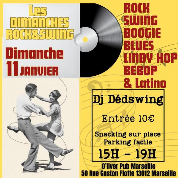 Date : Dimanche 11/01/2026 Horaires : 15h-19h puis poursuite de la soirée après 19h Tarifs : 10€ Organisateur : O'LIVER PUB Adresse de l'événement : O'LIVER PUB 50 RUE GASTON FLOTTE 13012 MARSEILLE 12 Informations complémentaires : Animation : DJ Dédswing. Styles musicaux : Rock, Swing, Boogie, Blues, Lindy Hop, Bebop, Latino. Snacking. Parking facile. Danses pratiquées : Danses latino, Lindy-hop, Rock, Swing Référence de l'annonce : 58981