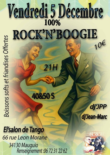 Date : Vendredi 05/12/2025 Horaires : 21h Tarifs : 10€ Organisateur : EL'SALON DE TANGO Adresse de l'événement : EL'SALON DE TANGO 66 RUE LÉON MORANE 34130 MAUGUIO Informations complémentaires : Animation : DJ JPP et DJ Jean-Marc. Thème : 100 % Rock'n'Boogie (années 40 et 50). Boissons softs et friandises offertes. Danses pratiquées : Rock, Tango Référence de l'annonce : 56935 call06 72 31 22 62