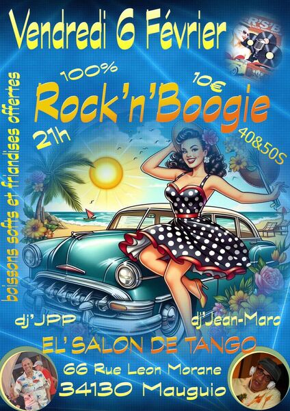 Date : 06/02/2026 (Événement passé) Horaires : 21h Tarifs : 10€ Organisateur : EL SALON DE TANGO Adresse de l'événement : EL SALON DE TANGO 66 RUE LÉON MORANE 34130 MAUGUIO Informations complémentaires : Animation : DJ JPP et DJ Jean-Marc. Soirée dansante années 40/50. Boissons softs et friandises offertes. Danses pratiquées : Rock, Swing, Tango Référence de l'annonce : 63231