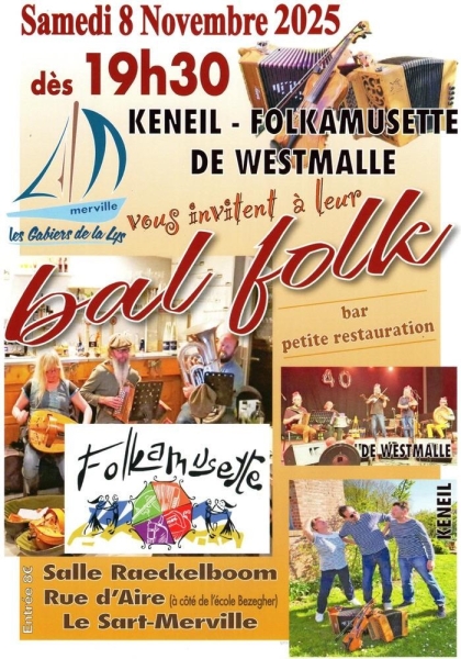 Date : Samedi 08/11/2025 Horaires : 19h30 à 23h30 Tarifs : 8€ Organisateur : LES CÔTIERS DE LA LYS MERVILLE Adresse de l'événement : SALLE RAECKELBOOM RUE D'AIRE 59660 MERVILLE Informations complémentaires : Animation : Folkamusette, De Westmalle, Keneil. Petite restauration. Bar. À côté de l?école Bezegher. Danses pratiquées : Danse folklorique Référence de l'annonce : 54181