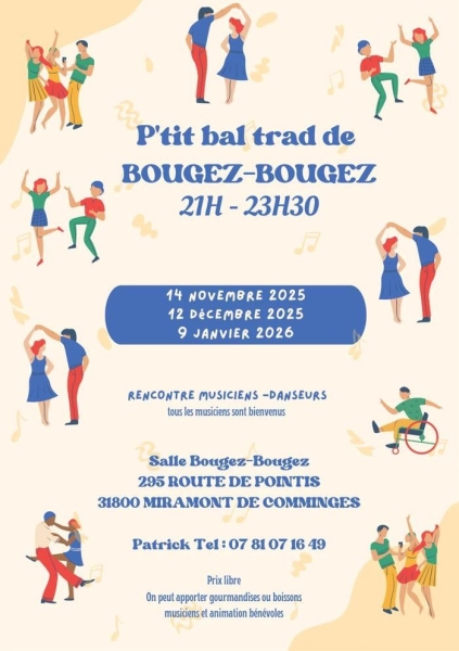 Dates : Vendredi 14/11/2025, Vendredi 12/12/2025, Vendredi 09/01/2026 Horaires : 21h à 23h30 Tarifs : Prix libre Organisateur : BOUGEZ-BOUGEZ Adresse de l'événement : SALLE BOUGEZ-BOUGEZ 295 ROUTE DE POINTIS 31800 MIRAMONT DE COMMINGES Informations complémentaires : Animation : Patrick. Rencontre musiciens-danseurs. Tous les musiciens sont bienvenus et bénévoles. Chacun apporte un plat ou une boisson à partager. Ambiance de bal trad avec session "boeuf" en fin de soirée. Participation libre pour les frais de la salle. Danses pratiquées : Danse folklorique Référence de l'annonce : 54267 call07 81 07 16 49