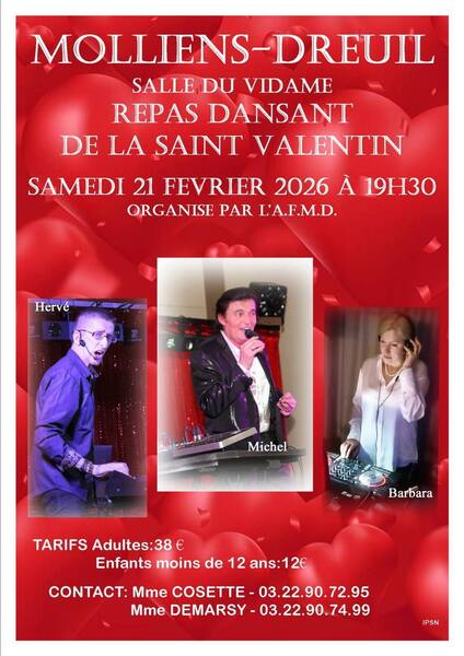Date : Samedi 21/02/2026 Horaires : 19h30 Tarifs : Adultes : 38€ - Enfants (-12 ans) : 12€ Organisateur : A.F.M.D. Adresse de l'événement : SALLE DU VIDAME 80540 MOLLIENS DREUIL Informations complémentaires : Animation : Orchestre Hervé Delohen. Saint-Valentin. Danses pratiquées : Danses de salon, Danses en ligne (Line dance), Danses rétro Référence de l'annonce : 63087 call03 22 90 72 95call03 22 90 74 99