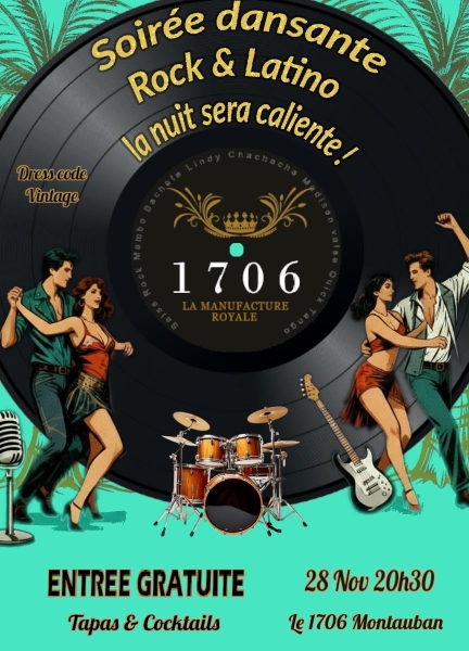 Date : Vendredi 28/11/2025 Horaires : 20h30 à 04h Tarifs : Entrée gratuite Organisateur : LE 1706 Adresse de l'événement : LE 1706, MANUFACTURE ROYALE 1 RUE DE LA MANDOUNE 82000 MONTAUBAN Informations complémentaires : Dress code Vintage. Tapas & Cocktails. Soirée à thème Rock et Latino. Danses pratiquées : Bachata, Danses latino, Lindy-hop, Rock, Salsa, Swing, Tango, Valse Référence de l'annonce : 54922 call06 12 20 39 53