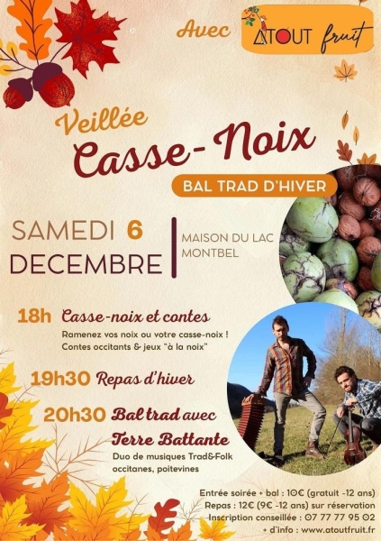 Date : 06/12/2025 (Événement passé) Horaires : 18h à 22h30 Tarifs : 10€ soirée + bal, gratuit -12 ans. Repas 12€ (9€ -12 ans) sur réservation. Organisateur : ATOUT FRUIT Adresse de l'événement : MAISON DU LAC 09600 MONTBEL Informations complémentaires : Animation : Terre Battante. Repas d'hiver à 19h30 sur réservation. Casse-noix et contes occitans à 18h. Jeux à la noix. Bénéfices au profit des actions de sauvegarde du patrimoine fruitier. Inscription vivement conseillée. Danses pratiquées : Danse folklorique Référence de l'annonce : 55568 call07 77 77 95 02