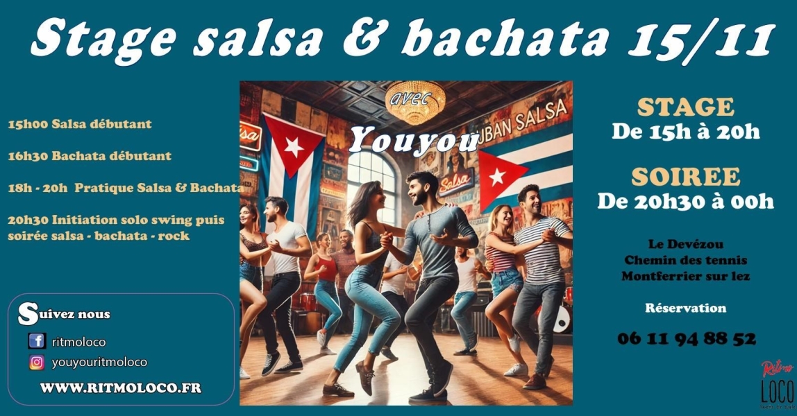 Date : Samedi 15/11/2025 Horaires : 15h à 00h Tarifs : 1 cours (1h30) + soirée + galette : 15€ / Full pass : 25€ / Soirée seule : 10€ Organisateur : RITMO LOCO Adresse de l'événement : LE DEVÉZOU CHEMIN DES TENNIS 34980 MONTFERRIER SUR LEZ Informations complémentaires : Animation : Youyou. 15h Bachata débutant. 16h30 Salsa cubaine débutant. 18h-20h Pratique libre salsera et bachata. 20h30 Initiation solo swing puis soirée salsa-bachata-rock. Softs à volonté. Galette incluse. Ambiance conviviale. Danses pratiquées : Bachata, Danses latino, Rock, Salsa, Salsa cubaine, Swing Référence de l'annonce : 54319 call06 11 94 88 52