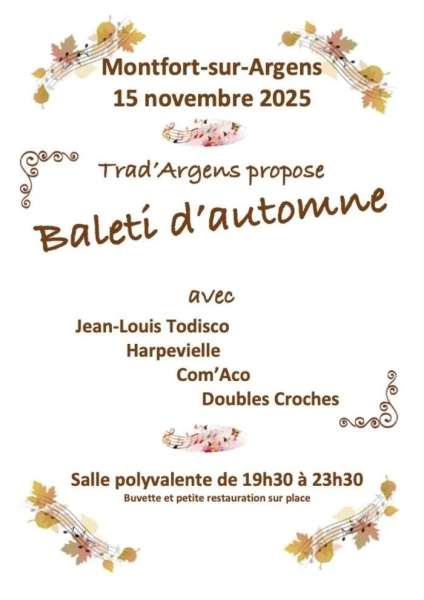 Date : 15/11/2025 (Événement passé) Horaires : 19h30 à 23h30 Tarifs : 8€ avec une boisson Organisateur : TRAD'ARGENS Adresse de l'événement : SALLE POLYVALENTE 18 GRANDE RUE 83570 MONTFORT SUR ARGENS Informations complémentaires : Animation : Jean-Louis Todisco, Harpevielle, Com'Aco, Double-Croches. Petite restauration et buvette. Danses pratiquées : Danse folklorique Référence de l'annonce : 54340