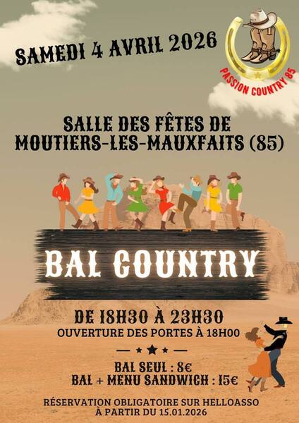 Date : Samedi 04/04/2026 Horaires : 18h30 à 23h30 Tarifs : Bal seul : 8€; Bal + menu sandwich : 15€ Organisateur : PASSION COUNTRY 85 Adresse de l'événement : SALLE DES FÊTES PLACE DE LA MAIRIE 85540 MOUTIERS LES MAUXFAITS Informations complémentaires : Ouverture des portes à 18h00. Réservation obligatoire sur HelloAsso à partir du 15.01.2026. Danses pratiquées : Country Référence de l'annonce : 61924