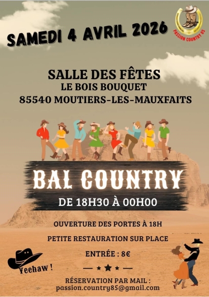Date : Samedi 04/04/2026 Horaires : 18h30 à 00h Tarifs : 8€ Organisateur : PASSION COUNTRY 85 Adresse de l'événement : SALLE DES FÊTES LE BOIS DU BOUQUET 85540 MOUTIERS LES MAUXFAITS Informations complémentaires : Ouverture des portes à 18h. Petite restauration sur place (sandwichs, soft, café, thé). Inscription avant le 4 avril 2026. Danses pratiquées : Country Référence de l'annonce : 65041