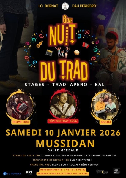 Date : Samedi 10/01/2026 Horaires : 20h30-2h Tarifs : Prévente 14€ ; sur place 15€ Organisateur : LO BORNAT DAU PÉRIGÒRD Adresse de l'événement : SALLE GERBAUD 6 RUE HENRI MOZE 24400 MUSSIDAN Informations complémentaires : Rejoignez-nous pour une soirée mémorable de danse, de musique et de convivialité !Après le succès de l'édition 2025 à Périgueux avec plus de 450 participants, avec un programme exceptionnel pour vous faire vibrer au rythme des traditions musicales d'ici et d'ailleurs.