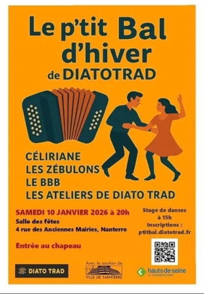 Date : Samedi 10/01/2026 Horaires : 20h à 0h Tarifs : Entrée au chapeau Organisateur : DIATO TRAD Adresse de l'événement : SALLE DES FÊTES 4 RUE DES ANCIENNES MAIRIES 92000 NANTERRE Informations complémentaires : Animation : Bruno Bizis Band, Céliriane, Les Zébulons, les ateliers de Diato Trad. Stage de danses à 15h. En partenariat avec la Ville de Nanterre et le département des Hauts-de-Seine. Danses pratiquées : Danse folklorique Référence de l'annonce : 57391
