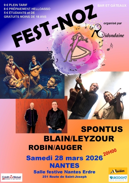 Date : Samedi 28/03/2026 Horaires : 20h à 01h Tarifs : 9€ ; 8€ en prépaiement ; 5€ étudiants et demandeurs d'emploi ; gratuit moins de 18 an Organisateur : LA RIDONDAINE Adresse de l'événement : SALLE FESTIVE NANTES ERDRE 251 ROUTE DE SAINT-JOSEPH 44000 NANTES Danses pratiquées : Danse bretonne Référence de l'annonce : 64681 call06 81 50 32 80