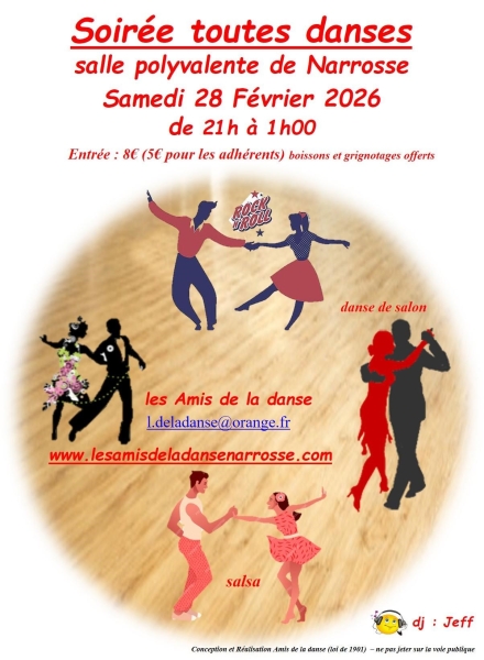 Date : Samedi 28/02/2026 Horaires : 21h à 1h Tarifs : 8€ (5€ pour les adhérents) Organisateur : LES AMIS DE LA DANSE Adresse de l'événement : SALLE POLYVALENTE DE NARROSSE 117 RUE DES ÉCOLES 40180 NARROSSE Informations complémentaires : Animation : DJ Jeff. Boissons et grignotages offerts. Danses : rock'n'roll, salsa, danses de salon. Danses pratiquées : Danses de salon, Danses latino, Rock Référence de l'annonce : 63761