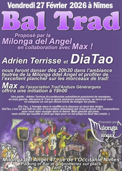 Date : Vendredi 27/02/2026 Horaires : 19h à 23h Tarifs : 12€ Organisateur : MILONGA DEL ANGEL Adresse de l'événement : MILONGA DEL ANGEL 47 RUE DE L'OCCITANIE 30000 NIMES Danses pratiquées : Danse folklorique Référence de l'annonce : 63745