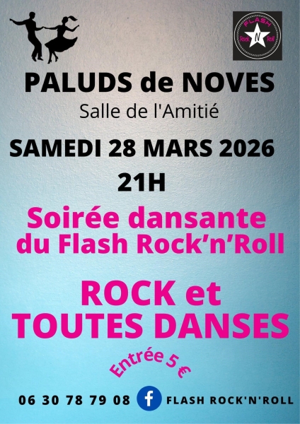 Date : Samedi 28/03/2026 Horaires : 21h Tarifs : Entrée 5€ Organisateur : FLASH ROCK'N'ROLL Adresse de l'événement : SALLE DE L'AMITIÉ DES PALUDS PLACE DU BICENTENAIRE DE LA RÉVOLUTION 13550 NOVES Informations complémentaires : Rock et toutes danses. Danses pratiquées : Danses de salon, Danses latino, Rock Référence de l'annonce : 64677 call06 30 78 79 08