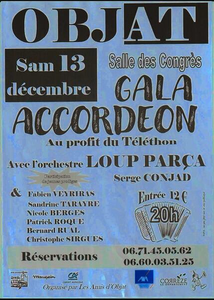 Date : Samedi 13/12/2025 Horaires : 20h Tarifs : Entrée 12€ Organisateur : LES AMIS D'OBJAT Adresse de l'événement : SALLE DES CONGRÈS 19130 OBJAT Informations complémentaires : Animation : Orchestre Bernard Rual, Nicole Berges... Danses pratiquées : Danses de salon, Danses en ligne, Danses rétro Référence de l'annonce : 55228 call06 71 45 05 62call06 60 03 51 25