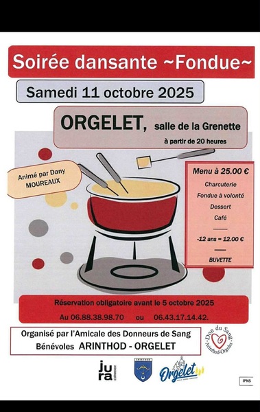 Date : Samedi 11/10/2025 Horaires : 20h Tarifs : 25€ / Enfants (-12 ans) : 12€ Organisateur : AMICALE DES DONNEURS DE SANG ARINTHOD-ORGELET Adresse de l'événement : SALLE DE LA GRENETTE 39270 ORGELET Informations complémentaires : Animation : Dany Moureaux. Menu : charcuterie, fondue à volonté, dessert, café. Réservation obligatoire avant le 5 octobre 2025. Buvette sur place. Danses pratiquées : Danses de salon, Danses en ligne, Danses rétro Référence de l'annonce : 52711 call06 88 38 98 70call06 43 17 14 42