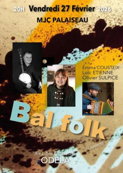 Dates : Vendredi 27/02/2026, Samedi 28/02/2026 Horaires : 20h Organisateur : MJC DE PALAISEAU Adresse de l'événement : MJC DE PALAISEAU PARC DE L'HÔTEL-DE-VILLE 91120 PALAISEAU Informations complémentaires : Animation : Air Libre Orchestra et trio improvisé. Bal folk Auvergne. Buvette. Participants : Emma Cousteix, Loïc Étienne, Olivier Sulpice. Bal multigénérationnel. Danses pratiquées : Danse folklorique Référence de l'annonce : 58897