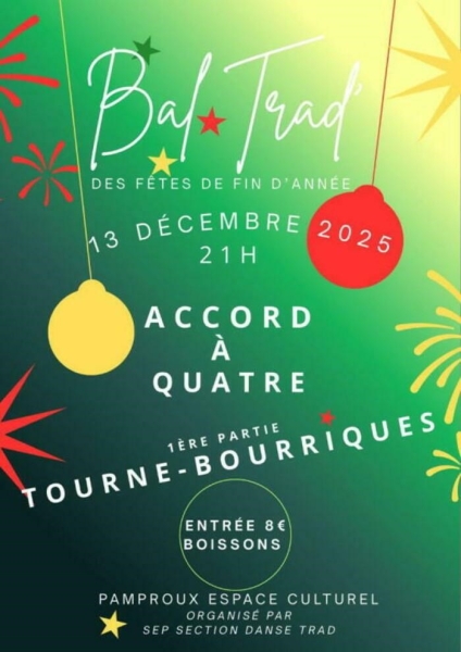 Date : 13/12/2025 (Événement passé) Horaires : 21h Tarifs : Entrée 8€ Organisateur : SEP SECTION DANSE TRAD Adresse de l'événement : ESPACE CULTUREL AVENUE DE LA GARE 79800 PAMPROUX Informations complémentaires : Animation : Accord à Quatre en 1ère partie Tourne-Bourriques. Boissons. Danses pratiquées : Danse folklorique Référence de l'annonce : 56147