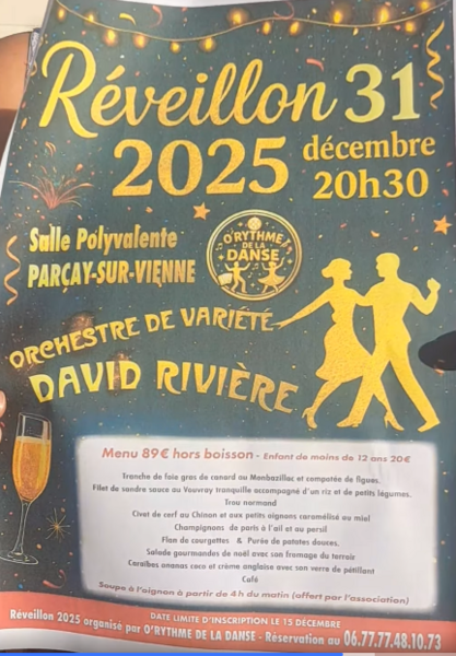 Date : Mercredi 31/12/2025 Horaires : 20h30 Tarifs : 89€ hors boisson. Enfant de moins de 12 ans 20€. Organisateur : O'RYTHME DE LA DANSE Adresse de l'événement : SALLE POLYVALENTE 37220 PARCAY SUR VIENNE Informations complémentaires : Animation : Orchestre de variété David Rivière. Menu : Tranche de foie gras de canard au Monbazillac et compotée de figues, Filet de sandre sauce au Vouvray tranquille accompagné de riz et petits légumes, Trou normand, Civet de cerf au Chinon aux petits oignons caramélisés au miel, Champignons des bois à l'ail et au persil, Gratin dauphinois et Purée de patates douces, Assiette de 3 fromages sur salade de saison, Caraïbes ananas coco et crème anglaise avec sa tuile croustillante, Café. Soupe à l'oignon offerte à 4h du matin. Date limite d'inscription : 15 décembre 2025. Danses pratiquées : Danses de salon, Danses en ligne, Danses rétro, Variété Référence de l'annonce : 50625 call06 77 48 10 73