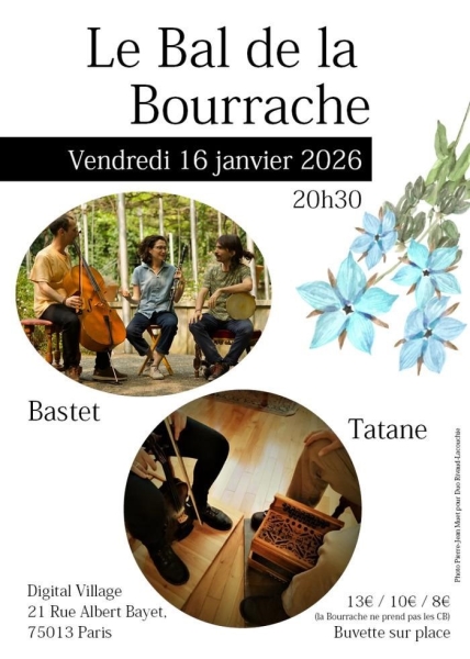 Date : Vendredi 16/01/2026 Horaires : 20h30 Tarifs : 13€ / 10€ / 8€ Organisateur : LA BOURRACHE Adresse de l'événement : DIGITAL VILLAGE 21 RUE ALBERT BAYET 75013 PARIS 13 Informations complémentaires : Animation : Bastet et Tatane. Buvette sur place. La Bourrache ne prend pas les cartes bancaires. Danses pratiquées : Danse folklorique Référence de l'annonce : 58234
