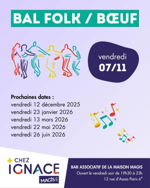 Dates : Vendredi 12/12/2025, Vendredi 23/01/2026, Vendredi 13/03/2026, Vendredi 22/05/2026, Vendredi 26/06/2026 Horaires : 20h à 23h Organisateur : CHEZ IGNACE Adresse de l'événement : MAISON MAGIS 12 RUE D'ASSAS 75006 PARIS 06 Informations complémentaires : Découvrir et à pratiquer les danses traditionnelles d'ici et d'ailleurs : en cercle, en chaîne, en duo ou en groupe. Musicien.nes bienvenu.es à la jam qui accompagne le bal !