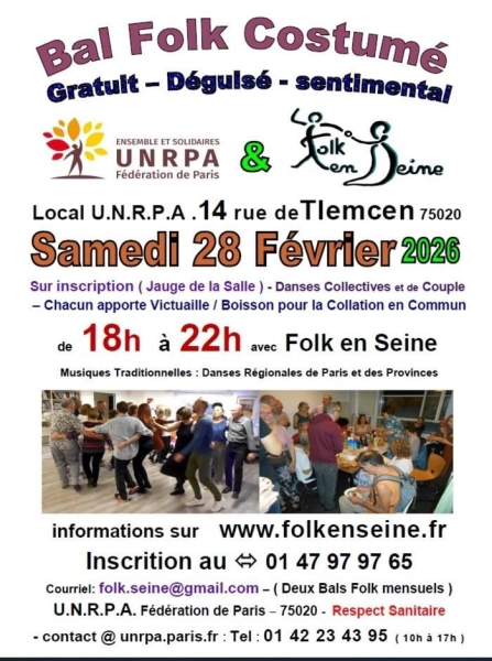 Date : Samedi 28/02/2026 Horaires : 18h à 22h Tarifs : Gratuit Organisateur : FOLK EN SEINE Adresse de l'événement : SALLE UNRPA 14 RUE DE TLEMCEN 75020 PARIS 20 Danses pratiquées : Danse folklorique Référence de l'annonce : 58418 call01 47 97 97 65call01 42 23 43 95
