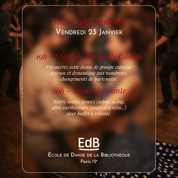 Date : Vendredi 23/01/2026 Horaires : Stage de 19h à 20h, soirée dansante à partir de 20h Tarifs : Stage 20€ (15€ pour les abonnés), soirée 20€ (15€ sur réservation avant le 20 ja Organisateur : ÉCOLE DE DANSE DE LA BIBLIOTHÈQUE Adresse de l'événement : ÉCOLE DE DANSE DE LA BIBLIOTHÈQUE 8 RUE OLIVIER MESSIAEN 75013 PARIS 13 Informations complémentaires : Stage de Rueda de Casino tous niveaux de 19h à 20h. Soirée toutes danses à partir de 20h. Danses : rock, swing, salsa, bachata, tango, danses standards et latines. Buffet à volonté (entrée, plat, dessert et boisson). Deux espaces : grande salle de danse et salle buffet. Danses pratiquées : Bachata, Danses de salon, Danses latino, Rock, Salsa, Tango, Tango argentin Référence de l'annonce : 61669 call07 44 76 16 07