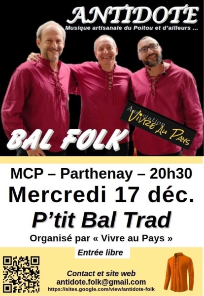 Date : Mercredi 17/12/2025 Horaires : 20h30 Tarifs : Entrée libre Organisateur : VIVRE AU PAYS Adresse de l'événement : MAISON DES CULTURES DE PAYS 1 RUE DE LA VAU SAINT-JACQUES 79200 PARTHENAY Informations complémentaires : Animation : Antidote-Folk. Musique artisanale du Poitou et d'ailleurs. Thème : P'tit Bal Trad-Veillée à danser. Danses pratiquées : Danse folklorique Référence de l'annonce : 56762