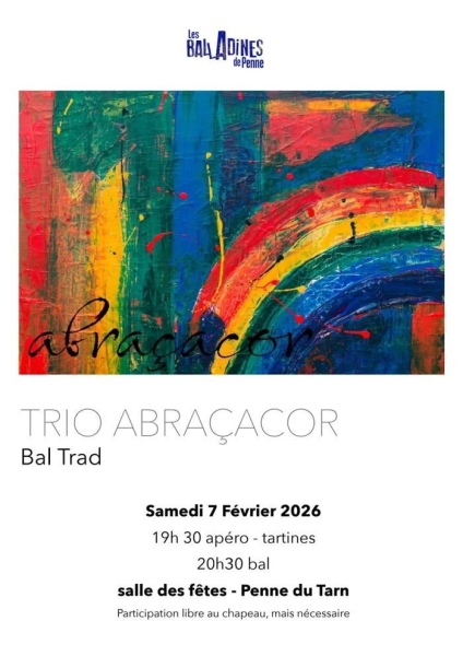 Date : 07/02/2026 (Événement passé) Horaires : 20h30 Tarifs : Participation libre au chapeau Organisateur : LES BALADINES DE PENNE Adresse de l'événement : SALLE DES FÊTES 81140 PENNE Informations complémentaires : Animation : Trio AbraçaCor. Apéro-tartines à 19h30. Danses pratiquées : Danse folklorique Référence de l'annonce : 62398