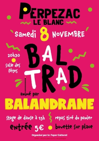 Date : 08/11/2025 (Événement passé) Horaires : 20h30 Tarifs : 5€ Organisateur : FOYER CULTUREL Adresse de l'événement : SALLE DES FÊTES 19310 PERPEZAC LE BLANC Informations complémentaires : Animation : Balandrane. Stage de danse à 15h. Repas tiré du panier. Buvette sur place. Danses pratiquées : Danse folklorique Référence de l'annonce : 53818