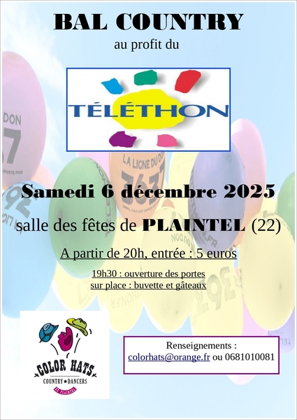 Date : Samedi 06/12/2025 Horaires : 20h Tarifs : 5€ Organisateur : COLOR HATS COUNTRY DANCERS Adresse de l'événement : SALLE DES FÊTES 22940 PLAINTEL Informations complémentaires : Ouverture des portes à 19h30. Au profit du Téléthon. Buvette et gâteaux sur place. Danses pratiquées : Country Référence de l'annonce : 53987 call06 81 01 00 81