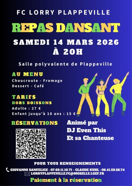 Date : Samedi 14/03/2026 Horaires : 20h Tarifs : Adulte : 27€ (hors boissons), Enfant jusqu'à 10 ans : 15€ Organisateur : FC LORRY PLAPPEVILLE Adresse de l'événement : SALLE POLYVALENTE 26 RUE DU GÉNÉRAL-DE-GAULLE 57050 PLAPPEVILLE Informations complémentaires : Animation : DJ Even This et sa chanteuse. Menu : choucroute garnie, fromage, dessert, café. Paiement à la réservation. Accès adapté aux personnes à mobilité réduite. Danses pratiquées : Danses de salon, Danses en ligne (Line dance), Danses rétro Référence de l'annonce : 63971 call06 41 59 58 74call07 69 11 10 71
