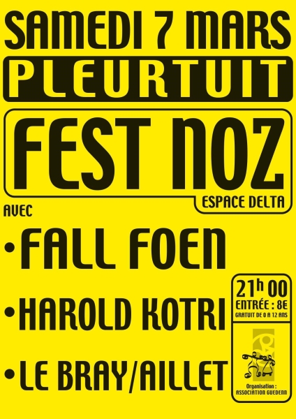 Date : Samedi 07/03/2026 Horaires : 21h à 02h Tarifs : 8€, gratuit de 0 à 12 ans Organisateur : ASSOCIATION GUEDENN DANSES BRETONNES Adresse de l'événement : ESPACE DELTA RUE RANSBACH-BAUMBACH 35730 PLEURTUIT Informations complémentaires : Animation : Fall Foen, Harold Kotri, Le Bray / Aillet. Parquet de 700 m². Buvette et pâtisseries sur place. Parking à proximité. Soirée conviviale adaptée aux enfants. Danses pratiquées : Danse bretonne Référence de l'annonce : 63837 call02 96 27 30 98