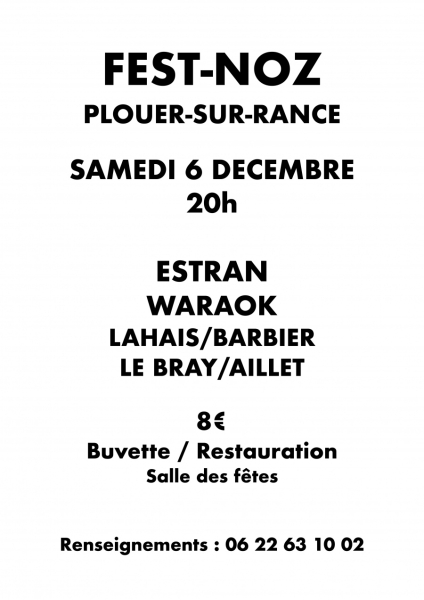 Date : Samedi 06/12/2025 Horaires : 20h Tarifs : 8€ / Gratuit - 12 ans Organisateur : PLOUËR'IN JAZZ Adresse de l'événement : SALLE DES FÊTES RUE DE LA VIEILLE CÔTE 22490 PLOUER SUR RANCE Informations complémentaires : Animation : Estran, Waraok, Lahais/Barbier, Le Bray/Aillet. Buvette et restauration. CB acceptée. Danses pratiquées : Danse bretonne Référence de l'annonce : 55018 call06 22 63 10 02