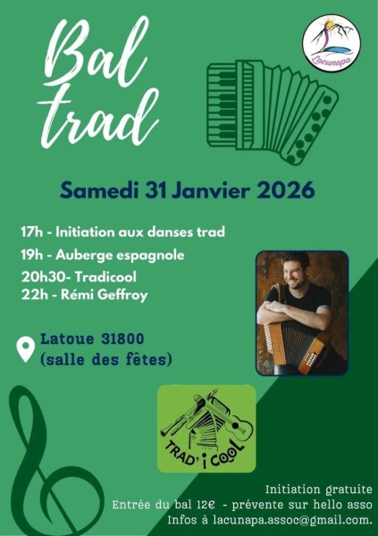Date : Samedi 31/01/2026 Horaires : 17h à 21h Tarifs : Initiation gratuite, bal 12€ (prévente sur HelloAsso) Organisateur : LACUNAPA Adresse de l'événement : SALLE DES FÊTES 16 RUE PRINCIPALE 31800 POINTIS INARD Informations complémentaires : 17h: initiation aux danses trad