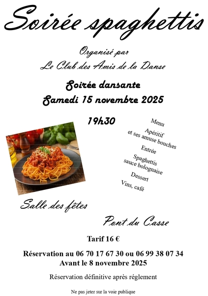 Date : Samedi 15/11/2025 Horaires : 19h30 Tarifs : 16€ Organisateur : CLUB DES AMIS DE LA DANSE Adresse de l'événement : 1 RUE DE LA LAURENDANE SALLE DES FÊTES 47480 PONT DU CASSE Informations complémentaires : Soirée spaghettis dansantes organiser par le club des Amis de la Danse de Pont du Casse Danses pratiquées : Danses de salon, Danses en ligne Référence de l'annonce : 51408 call06 99 38 07 34call06 70 17 67 30