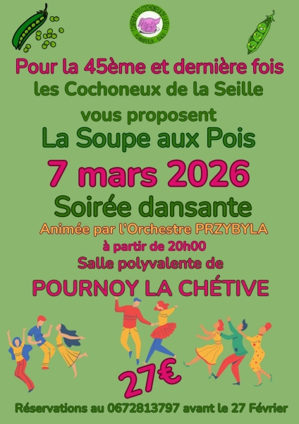 Date : Samedi 07/03/2026 Horaires : 20h Tarifs : 27€ Organisateur : LES COCHONEUX DE LA SEILLE Adresse de l'événement : SALLE POLYVALENTE RUE DE METZ 57420 POURNOY LA CHETIVE Informations complémentaires : Animation : Orchestre Przybyla. Accès adapté aux personnes à mobilité réduite. Réservation avant le 27 février. 45e et dernière édition. Danses pratiquées : Danses de salon, Danses en ligne (Line dance), Danses rétro Référence de l'annonce : 63880 call06 72 81 37 97