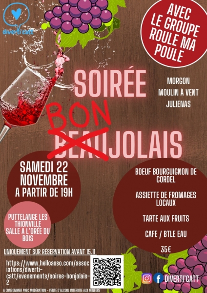 Date : Samedi 22/11/2025 Horaires : 19h Tarifs : 35€ par personne (tout compris) Organisateur : DIVERTICATT Adresse de l'événement : SALLE À L'ORÉE DES BOIS RUE DE LA MAIRIE 57570 PUTTELANGE LES THIONVILLE Informations complémentaires : Animation : Roule ma Poule. Dégustation de crus Morgon, Moulin-à-Vent et Juliénas. Menu bourguignon préparé par le chef Cordel (b?uf bourguignon, fromages locaux, tarte aux fruits, café et bouteille d?eau). Réservation obligatoire avant le 15 novembre. Ambiance festive et conviviale. Danses pratiquées : Danse folklorique Référence de l'annonce : 53339 call06 15 89 61 03