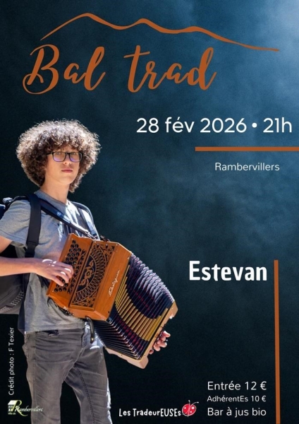 Date : Samedi 28/02/2026 Horaires : 21h Tarifs : Entrée 12€ ; Adhérents 10€ Organisateur : LES TRADOREUSES Adresse de l'événement : MAISON DU PEUPLE OU SALLE POLYVALENTE PLACE ÉMILE DROUEL 88700 RAMBERVILLERS Informations complémentaires : Animation : Estevan à l'accordéon diatonique. Bar à jus bio. Lieu exact précisé ultérieurement. Danses pratiquées : Danse folklorique Référence de l'annonce : 58419