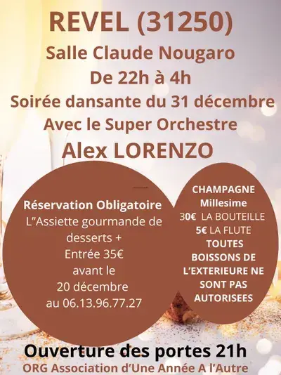 Date : Mercredi 31/12/2025 Horaires : 21h à 4h Tarifs : 35€ avec assiette de desserts comprise Organisateur : ASSOCIATION D'UNE ANNÉE À L'AUTRE Adresse de l'événement : SALLE CLAUDE NOUGARO ROUTE DE CASTRES 31250 REVEL Informations complémentaires : Animation : Orchestre Alex Lorenzo. Réservation obligatoire avant le 20 décembre. Champagne millésime 30€ la bouteille, 5€ la flûte. Boissons extérieures non autorisées. Ouverture des portes à 21h. Danses pratiquées : Danses de salon, Danses en ligne, Danses rétro Référence de l'annonce : 55268 call06 13 96 77 27