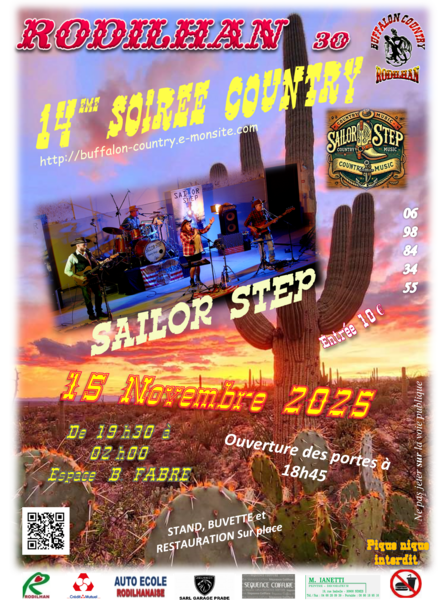 Date : Samedi 15/11/2025 Horaires : 19h30 à 02h00 Tarifs : 10,00€ Organisateur : BUFFALON COUNTRY Adresse de l'événement : ESPACE CULTUREL BERNARD FABRE CHEMIN DES CANAUX 30230 RODILHAN Informations complémentaires : Pour notre 14ème soirée annuelle dans l'Espace Culturel Bernard Fabre à Rodilhan (30), nous recevrons les SAILOR STEP pour animer la soirée en plus des CD de Pierre notre animateur, de 19h30 à 02h non stop, ouverture des portes à 18h45.