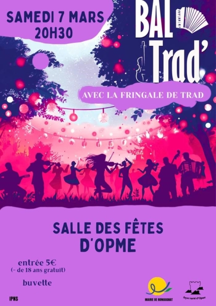 Date : Samedi 07/03/2026 Horaires : 20h30 Tarifs : 5€ (- de 18 ans gratuit) Organisateur : MAIRIE DE ROMAGNAT Adresse de l'événement : SALLE DES FÊTES D'OPME RUE DU MARÉCHAL DE LATTRE DE TASSIGNY 63540 ROMAGNAT Informations complémentaires : Animation : La Fringale de Trad. Initiation aux danses avec Marion une demi-heure avant le bal et pendant le bal. Buvette. Danses pratiquées : Danse folklorique Référence de l'annonce : 58919
