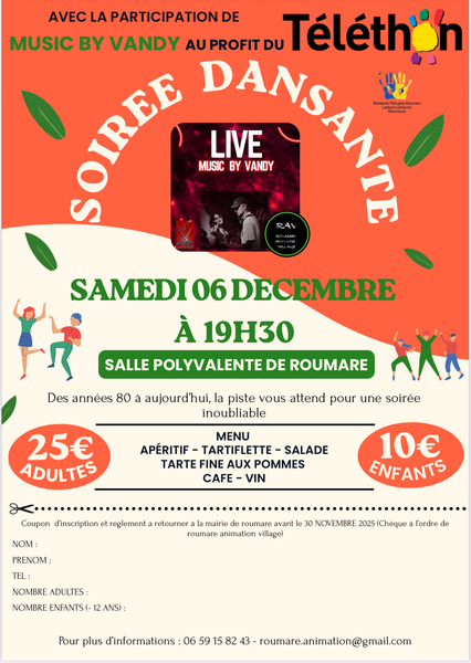 Date : 06/12/2025 (Événement passé) Horaires : 19h30 Tarifs : 25€ par adulte 10€ par enfant Organisateur : ROUMARE ANIMATION VILLAGE Adresse de l'événement : SALLE POLYVALENTE PLACE DE LA LIBERTÉ 76480 ROUMARE Informations complémentaires : Repas APÉRITIF TARTIFLETTE FROMAGE DESSERT CAFÉ VIN Danses pratiquées : Variété Référence de l'annonce : 56282 call06 19 48 32 21