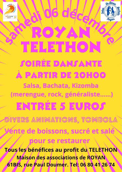 Date : Samedi 06/12/2025 Horaires : 20h Tarifs : 5€ (au profit du Téléthon) Adresse de l'événement : MAISON DES ASSOCIATIONS DE ROYAN 61BIS RUE PAUL DOUMER 17200 ROYAN Informations complémentaires : Salsa, bachata, kizomba, merengue, rock, généraliste. Animations et tombola. Vente de boissons, sucré et salé pour se restaurer. Tous les bénéfices au profit du Téléthon. Danses pratiquées : Bachata, Kizomba, Merengue, Rock, Salsa Référence de l'annonce : 56921 call06 80 41 26 74