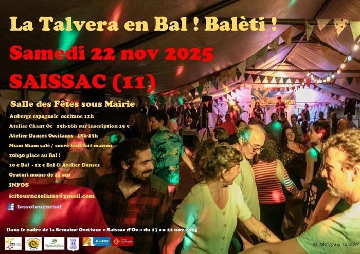 Date : Samedi 22/11/2025 Horaires : 20h30 Tarifs : 10€ le bal, 12€ bal et atelier, gratuit moins de 12 ans Organisateur : ASSOCIATION LASSOTOURNESOL Adresse de l'événement : SALLE DES FÊTES PLACE DE LA MAIRIE 11310 SAISSAC Informations complémentaires : Animation : Groupe La Talvera. Atelier de chant occitan 13h à 16h avec Aelis Loddo 15€ sur inscription. Atelier de danses occitanes 18h à 19h. Auberge espagnole occitane à 12h. Vente de boissons et nourriture salée et sucrée maison. Dans le cadre de la Semaine occitane "Saissac d'Oc". Danses pratiquées : Danse folklorique Référence de l'annonce : 54443