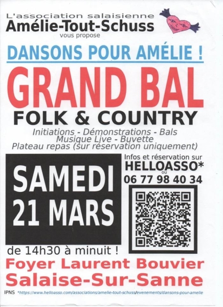 Dates : Samedi 21/03/2026, Dimanche 22/03/2026 Horaires : 14h30 à minuit Tarifs : 10€ Organisateur : ASSOCIATION AMÉLIE-TOUT-SCHUSS Adresse de l'événement : FOYER LAURENT BOUVIER 4 RUE DU 11 NOVEMBRE 38150 SALAISE SUR SANNE Danses pratiquées : Danse folklorique Référence de l'annonce : 64595 call06 77 98 40 34