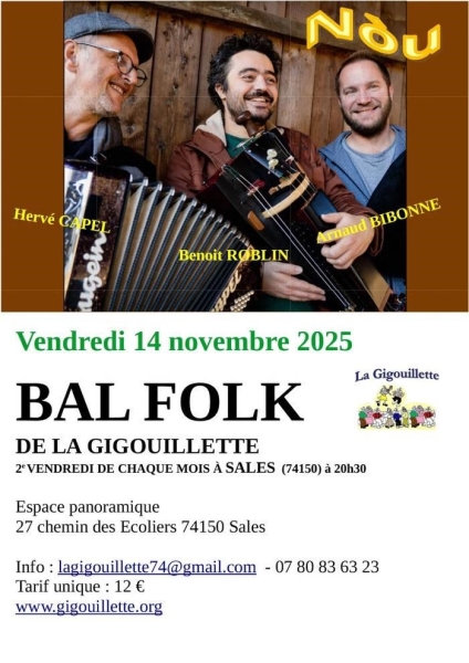 Date : Vendredi 14/11/2025 Horaires : 20h30 Tarifs : 12€ Organisateur : LA GIGOUILLETTE Adresse de l'événement : ESPACE PANORAMIQUE 27 CHEMIN DES ÉCOLIERS 74150 SALES Informations complémentaires : Animation : Nou, Hervé Capel, Benoit Roblin, Arnaud Bibonne. Danses : avant-deux, bourrées, rondeaux. Bal de Nouvelle-Aquitaine. Billetterie sur HelloAsso. Bal mensuel du 2e vendredi du mois. Danses pratiquées : Danse folklorique Référence de l'annonce : 54262 call07 80 83 63 23