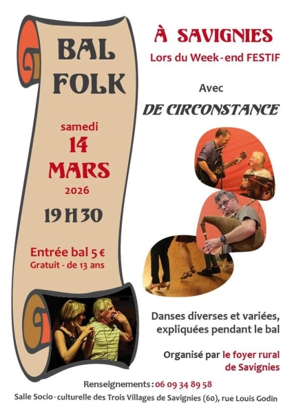 Date : Samedi 14/03/2026 Horaires : 19h30 à 23h30 Tarifs : 5€ (gratuit -13 ans) Organisateur : FOYER RURAL DE SAVIGNIES Adresse de l'événement : SALLE SOCIO-CULTURELLE DES TROIS VILLAGES RUE LOUIS GODIN 60650 SAVIGNIES Informations complémentaires : Animation : De Circonstance. Danses diverses et variées expliquées pendant le bal. Week-end festif. Danses pratiquées : Danse folklorique Référence de l'annonce : 63995 call06 09 34 89 58