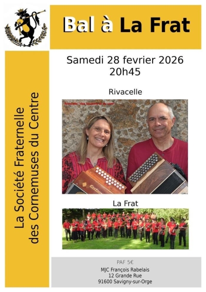 Date : Samedi 28/02/2026 Horaires : 20h45 Tarifs : 5€ Organisateur : LA SOCIÉTÉ FRATERNELLE DES CORNEMUSES DU CENTRE Adresse de l'événement : MJC FRANÇOIS RABELAIS 12 GRANDE RUE 91600 SAVIGNY SUR ORGE Informations complémentaires : Animation : Rivacelle. Danses pratiquées : Danses de salon, Danses en ligne (Line dance), Danses rétro Référence de l'annonce : 62740